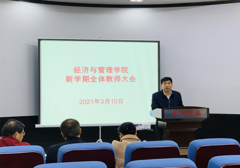 覃举东院长围绕新学期学院教学工作、目标考核、绩效分配等问题,提出工作思路并布置相关工作任务。同时提出新学期要推进教学改革、督促教师提升科研水平、做好教学诊改、校庆工作等工作。