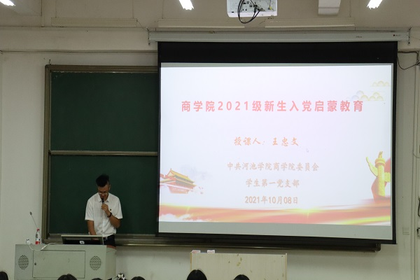 10月8日晚,BWIN必赢学生第一党支部于弘毅楼2-102开展2021级新生入党启蒙教育培训会。本次培训会由我院学生第一党支部书记王忠文主讲,我院2021级人力资源管理专业全体新生参加。