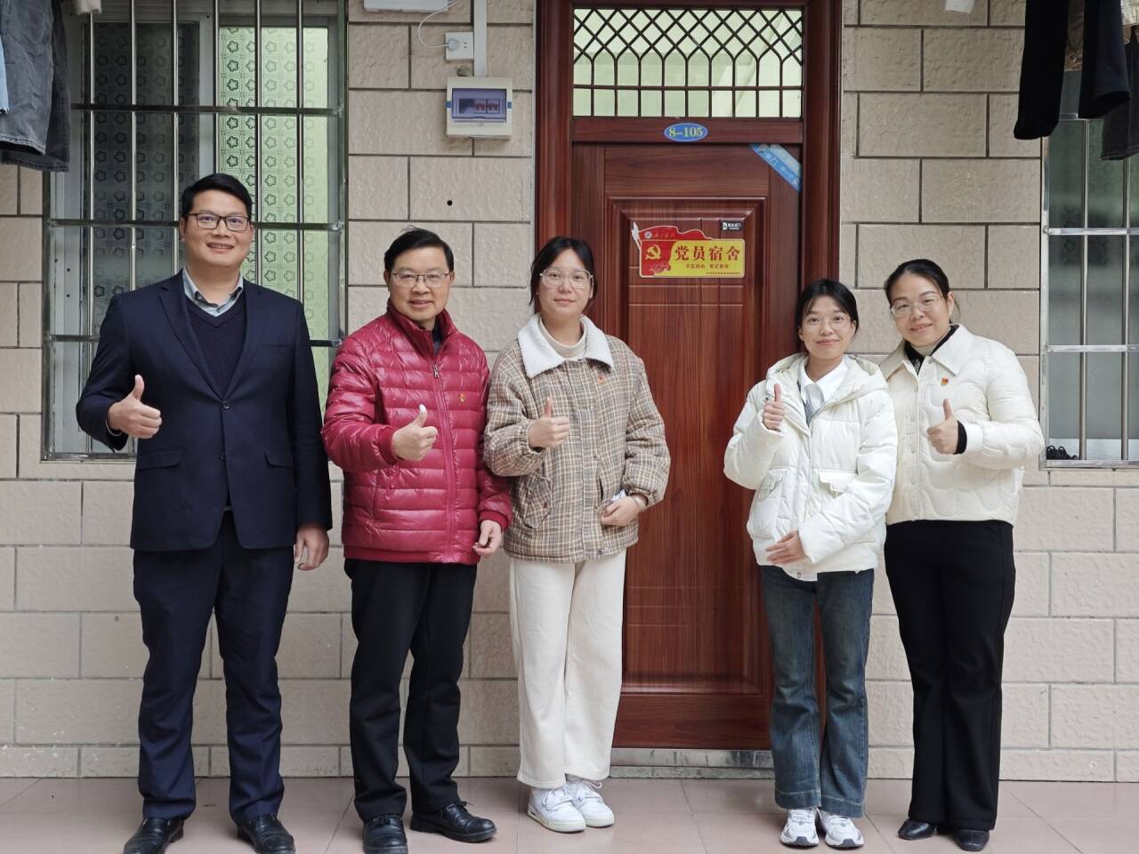 韦书觉为师生党员上了一堂微党课。我院预备党员苏静同志代表发言。学院党委为2024年“学习强国”平台排名前列的教师党员以及学生党员进行“学习之星”表彰,同时向各学生党员宿舍发放“党员宿舍牌”。活动结束后韦书觉一行深入学生宿舍,与学生党员携手将鲜艳的“党员宿舍”铭牌悬挂于宿舍门前。