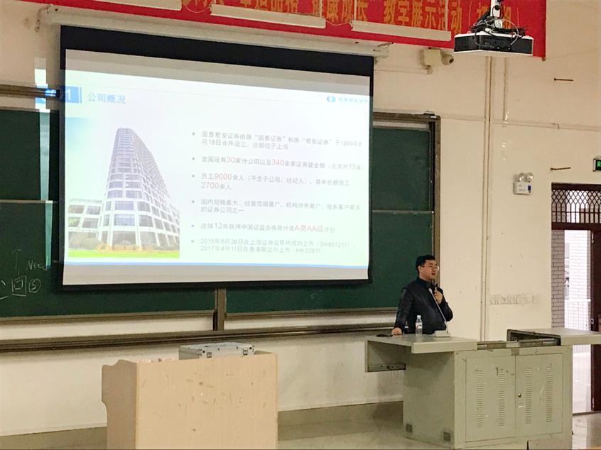 为了培养同学们对金融方面的工作的兴趣和掌握理财的方法,扩大将来的就业方向,12月25日下午,我院有幸邀请到了国泰君安证券公司河池营业部的负责人在弘毅楼1-105教室召开国泰君安证券财商教育进校园系列宣讲会,BWIN必赢经济系主任程恋婷老师、辅导员黄挺龙老师和同学们共同参与本次宣讲会。会议主要面向17级贸易经济专业和17级市场营销专业的学生。