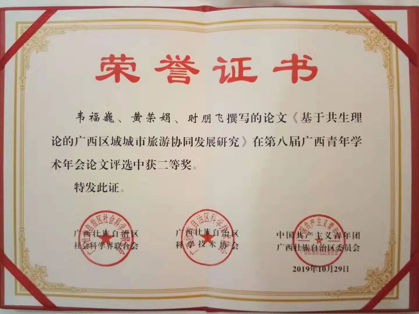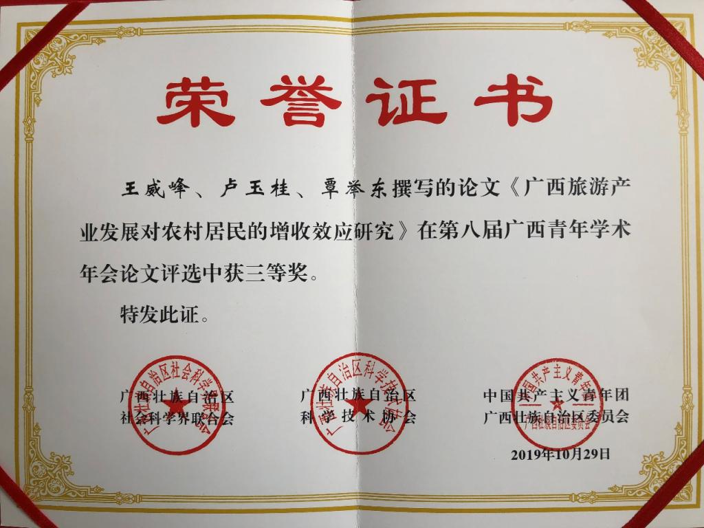 本届年会征集到论文329篇,其中社会科学类论文209篇,评出一等奖4篇,二等奖15篇,三等奖26篇;自然科学类论文120篇,评出一等奖5篇,二等奖15篇,三等奖30篇。年会对获奖论文进行了表彰。我院韦福巍老师和黄荣娟老师等合作的论文《基于共生理论的广西区域城市旅游协同发展研究》、王威峰老师和覃举东老师等合作的论文《广西旅游产业发展对农村居民的增收效应研究》分别在本次年会论文评选中获二等奖、三等奖。(通讯员 王威峰)