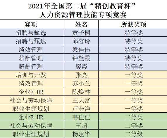 2021年1月21日-28日,全国第二届“精创教育杯”人力资源管理技能专项竞赛逐项开赛。在我校经管学院人力资源管理系主任刘智的指导带领下,由18级人力资源管理专业13名学生组成的代表队最终获得特等奖5名,一等奖5名,二等奖3名。