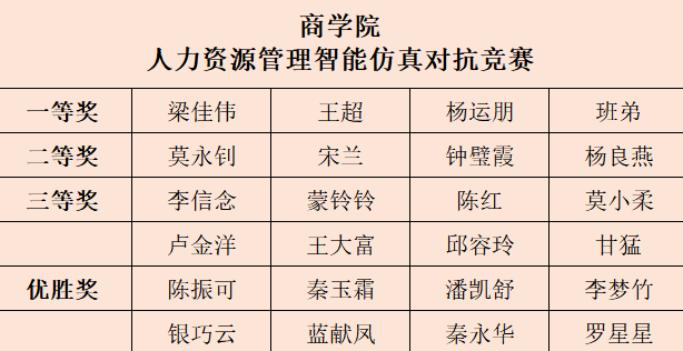 本次竞赛坚持理论与实践相结合的理念,以赛促教,使学生做到学以致用,充分展示自己的专业水平和职业技能,进一步推进实践育人工作开展,推动我院人力资源管理专业的实践教学改革,提高人才培养质量。(通讯员:钟璧霞)