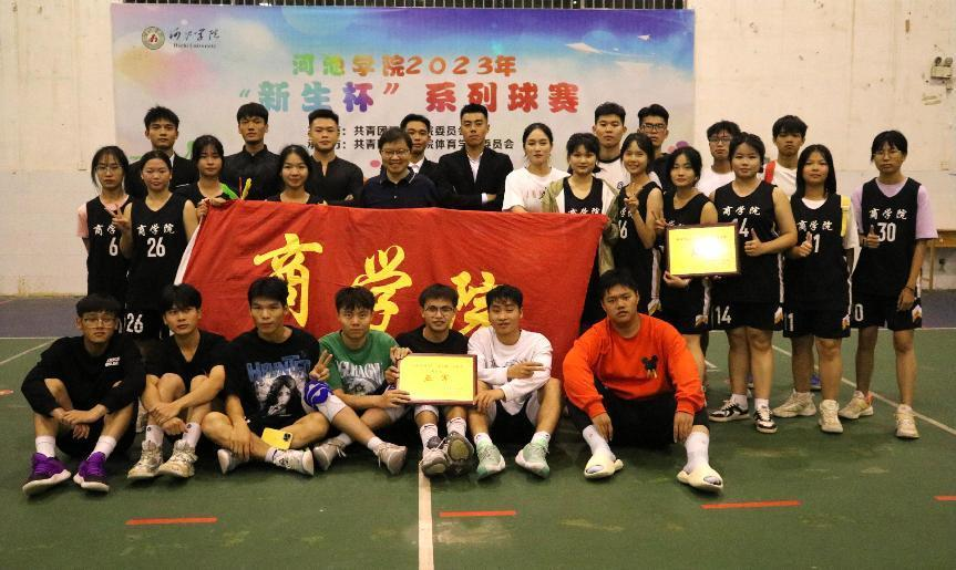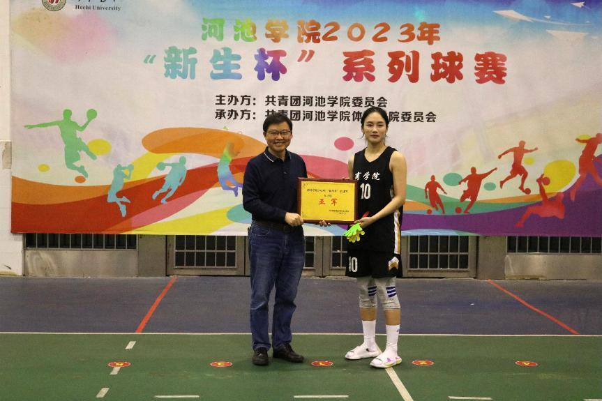 一声哨响,双方队员迅速开始进行激烈的争夺。面对强大的对手我院队员们丝毫不惧,彼此间默契配合,不断寻找时机冲破体院的防线投篮进分,坚持奋战到最后一刻。最终我院男篮女篮队伍以亚军的优秀成绩为本次“新生杯”篮球赛画下圆满的句号。韦书觉为他们颁奖并合影留念。