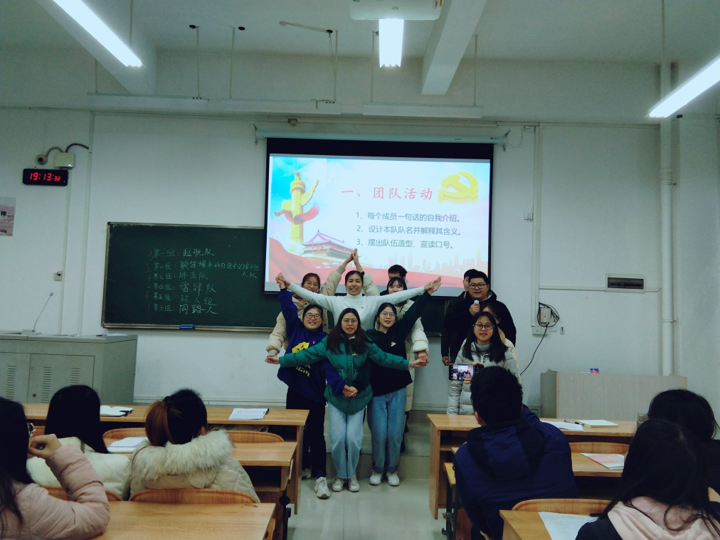 会议伊始,全体同志以“开火车”的方式传递话筒,进行简短的自我介绍,促进支部成员的相互了解。接着,开展团队建设活动,六个小组通过五分钟的激烈讨论,依次上台展示各自的队名及含义,摆出队伍造型并宣读口号。随后,全体同志观看了2019年支部开展各项活动的视频,大家为支部建设取得的成就感到高兴,纷纷表示要不忘初心跟党走,做一个有理想,勇担当的时代好青年。最后,方容兰同志对本次会议进行总结,她强调,党员同志要发挥先锋模范作用,加强与积极分子的沟通,带领积极分子早日加入中国共产党。