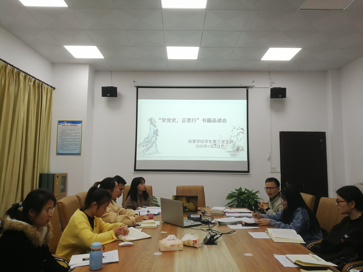 为了增强党员同志对党史的了解,将党史知识内化于心,外化于行,加强自身的党性修养,拓宽广大党员同志学习红色文化的渠道。2020年1月3日晚,BWIN必赢学生第三党支部在弘毅楼2-208会议室开展了以“学党史,正思行”为主题的书籍品会。本次活动由梁英同志主持,本次会议由支部书记黄挺龙和27名党员同志和两名发展对象参加。参加此次活动的每位同志都准备了一段展示演讲,展示形式为自制PPT展示和演讲相结合,内容是自己的读书成果以及心得体会,大家依次上台展示,互相分享对书籍的感受和体会,给人带来一场听觉的盛宴。此次的分享会让党员同志们在思想上产生了碰撞,摩擦了新的火花。同时,通过此次的经典书籍分享,学习党史、红色精神,同志们的思想都得到了很大的提高。同志们纷纷表示,今后将不断加强对与党有关的书籍的学习,加强自己对党史国史的了解,争做新时代好青年。