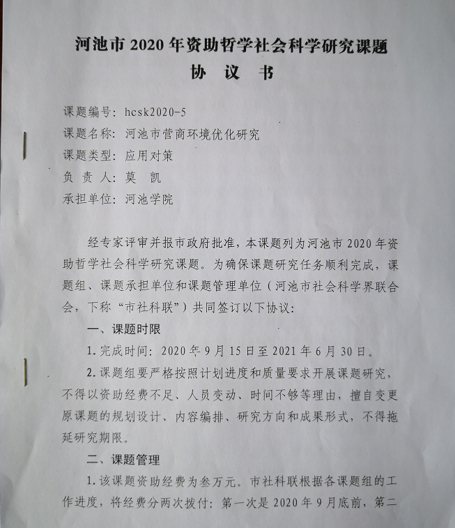 据悉,自2016年河池市资助哲学社会研究课题开展以来,BWIN必赢每年均有教师获得该类项目的立项并顺利结题,截止今年共有7项项目成功立项,其中今年新增的立项与结题项目均为莫凯老师和王威峰老师主持的第二项河池市资助哲学社会研究课题,充分体现了我院教师将科学研究聚焦地方经济发展现实问题,坚持在服务地方方面献计献策。