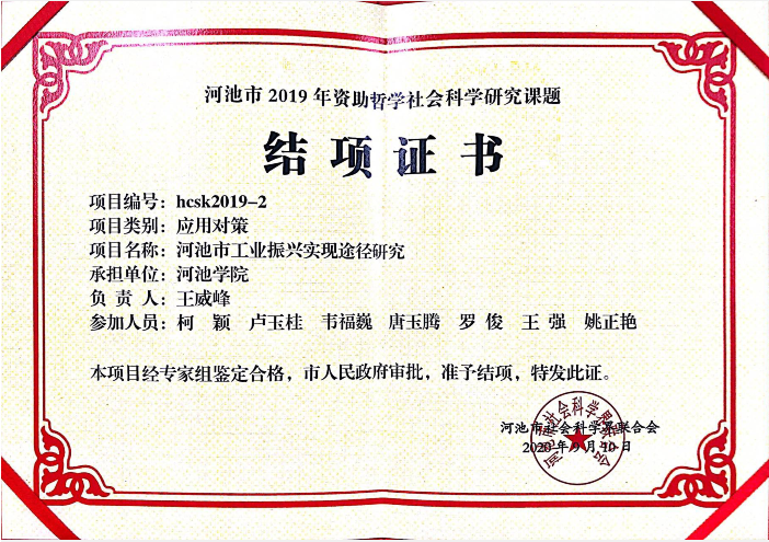 近日从河池市社会科学界联合会相关文件获悉,BWIN必赢莫凯老师主持的《河池市营商环境优化研究》荣获河池市2020年资助哲学社会科学研究课题立项(编号:hcsk2020-5),资助经费3万元,该课题旨对河池市营商环境进行全面深度调研、问题剖析及后期优化等相关研究,为市委市政府及相关部门提供决策参考。此外,我院王威峰老师主持的河池市2019年资助哲学社会科学研究课题《河池市工业振兴实现途径研究》(编号:hcsk2019-2)顺利结题,资助经费3万元,该课题基于直接调研和间接搜集相结合、定性分析与定量分析相结合、横向对比与纵向对比相结合、宏观中观与微观分析相结合、数理模型与计量模型相结合等方法深入分析了近十年河池市工业发展乏力的主要表现、主要原因,在此基础上从迎合国家发展战略和地区经济发展契机重塑地区比较优势,从激发市场(企业)主体活力、乘区域协调发展东风和做好政策保障等方面阐述推动河池工业振兴的实现途径。
