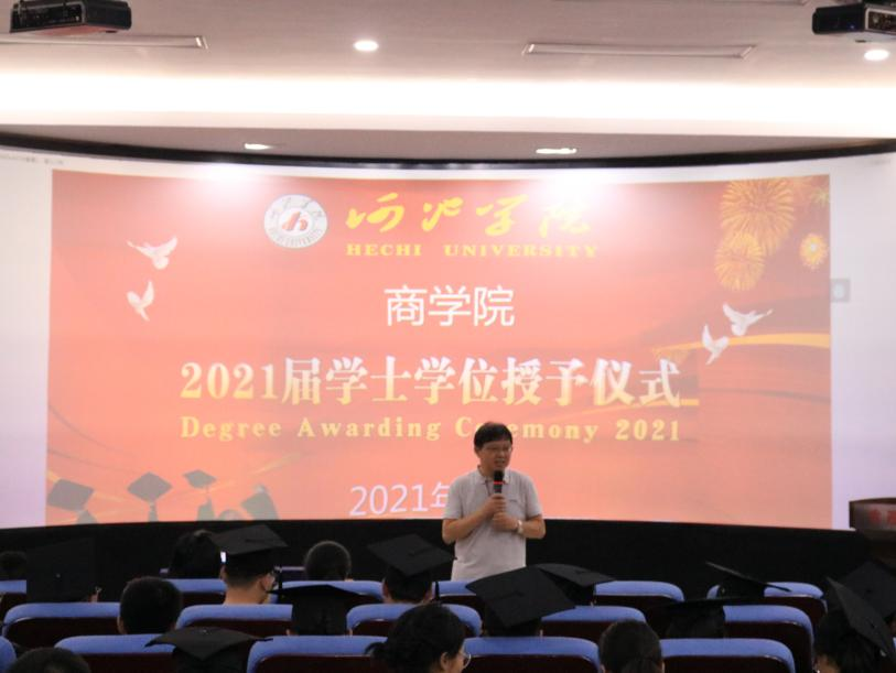 6月22日下午,我院于弘毅楼3-504教室开展2021届学士学位授予仪式。我院党委书记韦书觉、院长覃举东、副院长韦福巍、肖海燕、专任教师代表及2021届毕业生代表出席仪式。