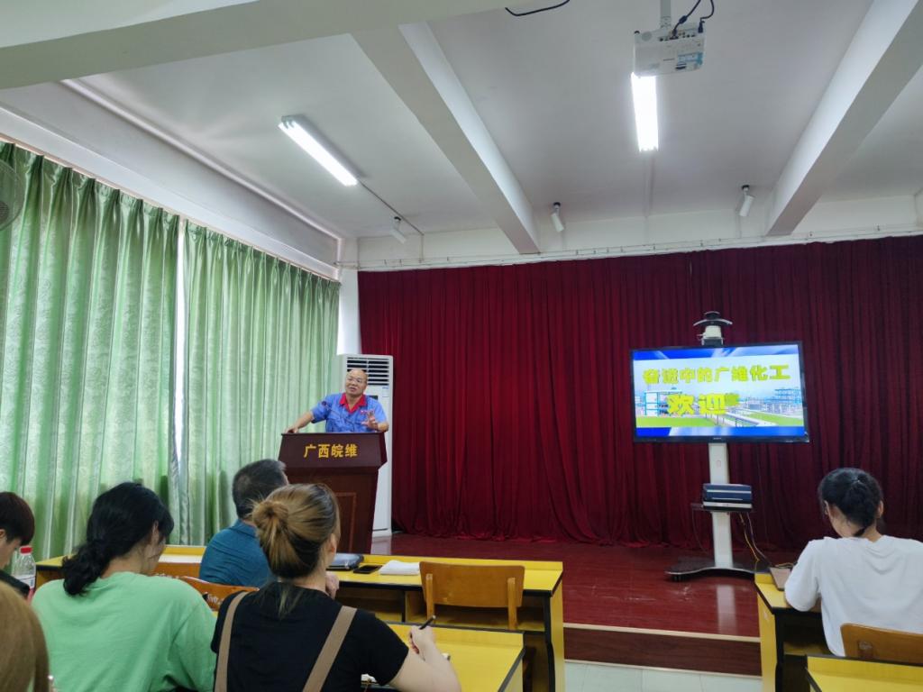 广西皖维工会主席韦茂双对到来的师生表示欢迎,对公司发展历程、现有职工情况、人才成长通道和部门组成情况进行了详细的介绍。同学们观看公司宣传视频并进行现场交流学习。莫凯在活动中鼓励学生继续“以知促行”,在每一次的见习中都更一步精进业务,提高综合素质。