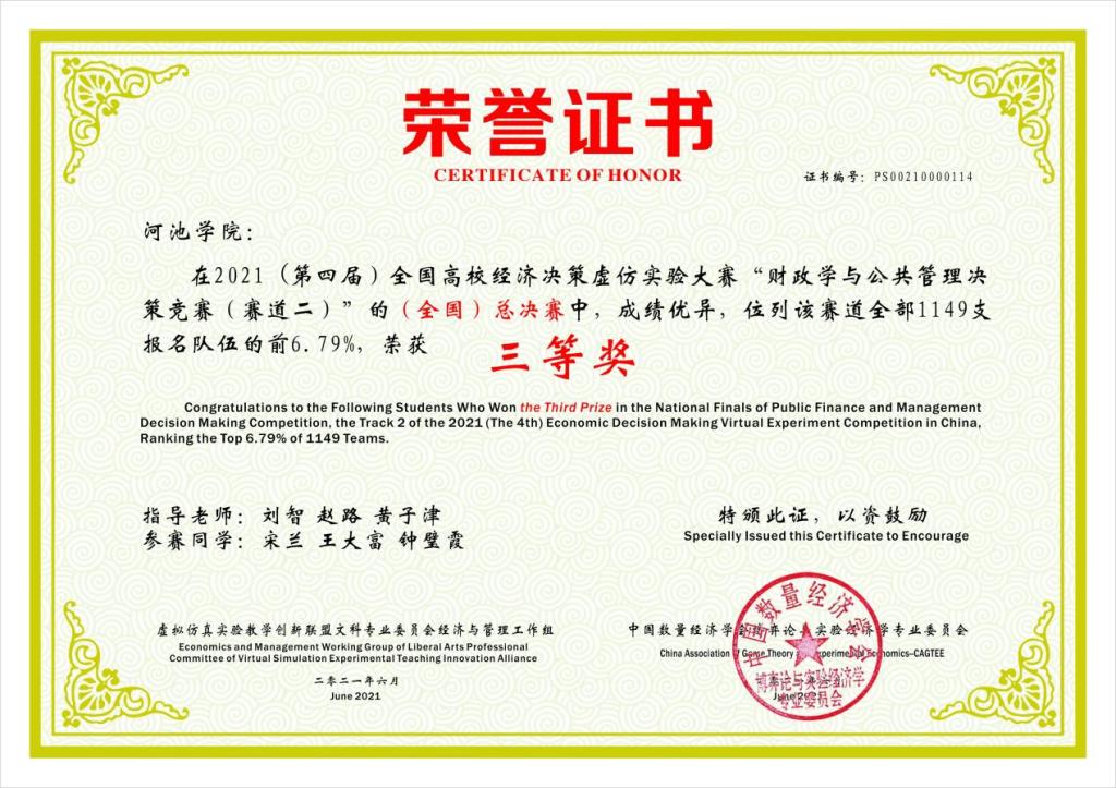 近日,第四届全国高校经济决策虚仿实验大赛“财政学与公共管理决策竞赛”落下帷幕。在我院专任教师刘智、赵路、黄子津指导带领下,18级人力资源管理专业宋兰、王大富、钟璧霞组成的代表队最终荣获全国总决赛三等奖。