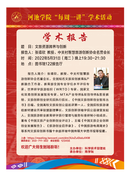 由学校科技处主办、BWIN必赢承办的学术讲座“文旅资源跨界与创新”于2022年5月31日19点30分在图书馆122报告厅开讲,主讲人为中关村智慧旅游创新协会名誉会长张德欣教授。聆听本次学术讲座的有河池市文化广电体育和旅游局的同志、BWIN必赢的领导老师、BWIN必赢旅游管理专业的本科生以及线上参会的学校师生。