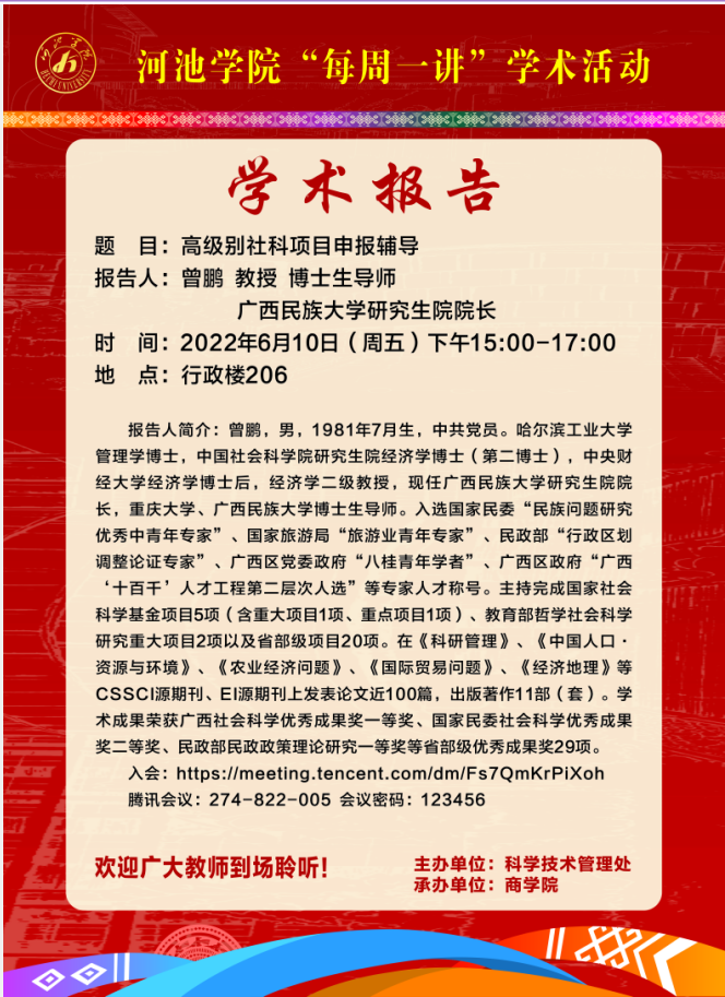 为加强国家社科基金申报的组织和指导,2022年6月10日下午,我院举办国家社科基金申报专题讲座。广西民族大学研究院长曾鹏教授受邀在行政楼206为BWIN必赢教师做“国家社会科学基金项目申报技巧与艺术”的专题讲座。