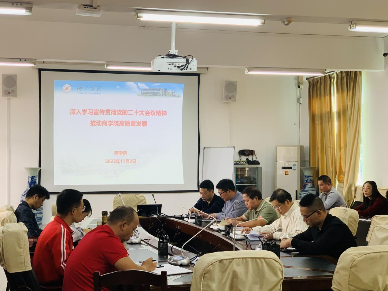 韦书觉强调,学习宣传贯彻党的二十大精神是当前和今后一个时期学院的首要政治任务,要求学院师生要充分认识党的二十大的重大意义,全院上下要按照习近平总书记“五个牢牢把握”和“全面学习、全面把握、全面落实”的重要指示精神,迅速在掀起学习宣传贯彻二十大精神的热潮,切实增强学习贯彻落实的思想自觉、政治自觉和行动自觉,结合学院实际,将二十大精神全面融入教学、科研等工作当中,推动学院高质量发展。