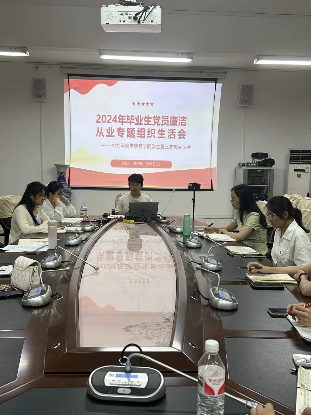 2024年5月13日晚上,BWIN必赢学生第三党支部在我校行政楼206举办2024年毕业生党员廉洁从业专题组织生活会暨党纪学习教育党课,与会人员有BWIN必赢学生第三党支部书记陈亚珍以及毕业学生党员。活动由陈亚珍同志主持。