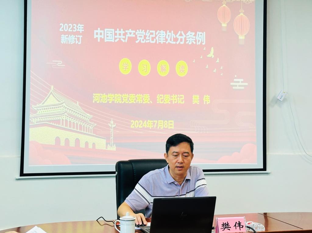 樊伟围绕深入了解《条例》历次修订情况、深刻认识《条例》修订的重大意义、准确把握《条例》修订的主旨要义、全面理解新修订《条例》六大纪律、认真抓好新修订《条例》学习贯彻等五个方面,对《条例》进行了详细阐述和深刻解读,并结合近些年区内外高校发生的真实违法违纪案例深入剖析,做到以案促学,引导全体师生党员强化学纪、知纪、明纪、守纪意识,准确把握“六大纪律”的主旨要义和规定要求,推动党规党纪入脑入心,为进一步全面深化改革、顺利推进中国式现代化,实现新时代新征程党的使命任务提供坚强纪律保障。樊伟指出,在全党开展党纪学习教育,是以习近平同志为核心的党中央加强党的纪律建设、推动全面从严治党向纵深发展的重要举措。
